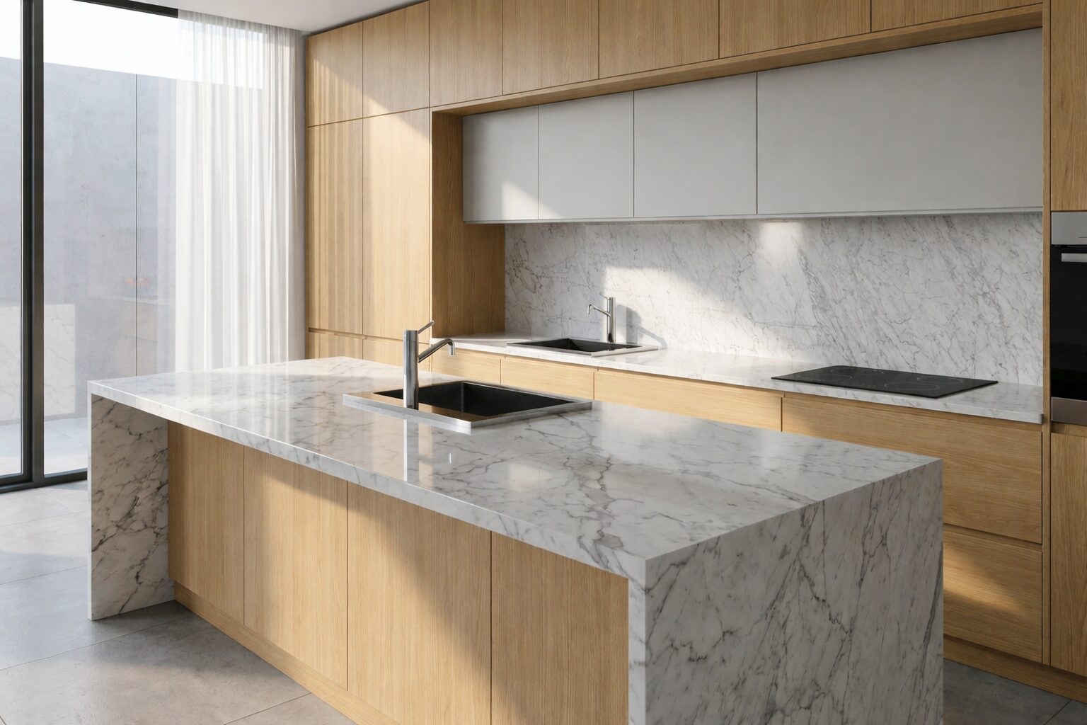 A light marble, such as Carrara White, helps create a brighter and visually more balanced environment. It is often chosen for modern kitchens or smaller spaces because it reflects light and enhances the perception of openness.