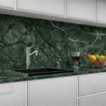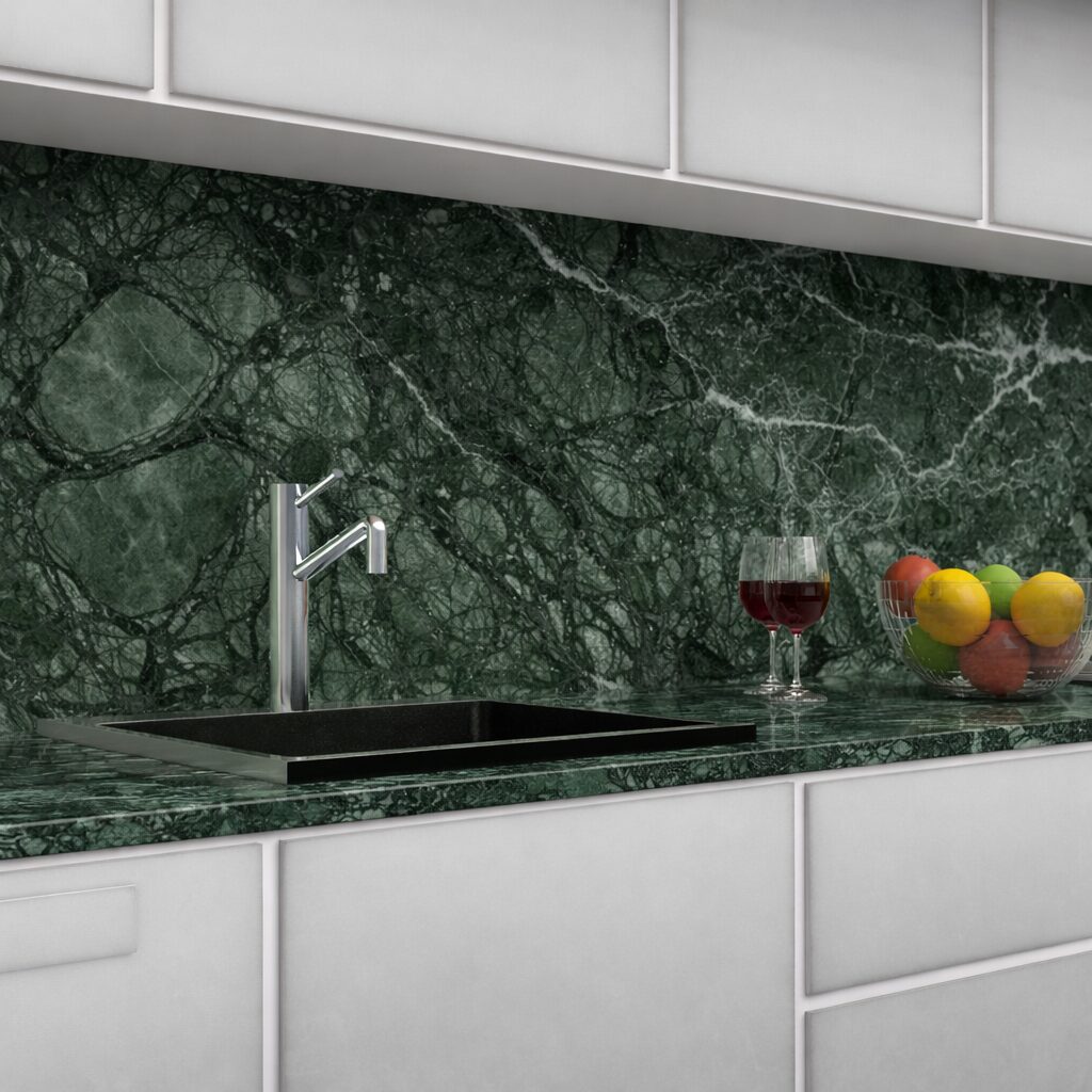 Alle Küchenarbeitsplatten und Rückwände aus Verde Guatemala Marmor werden einer wasser- und ölabweisenden sowie fleckenabweisenden Behandlung unterzogen, die für den Lebensmittelbereich zertifiziert ist und die Widerstandsfähigkeit gegenüber potenziell fleckenverursachenden Substanzen wie Lebensmitteln, Flüssigkeiten oder Reinigungsmitteln, die üblicherweise in der Küche verwendet werden, erhöht.